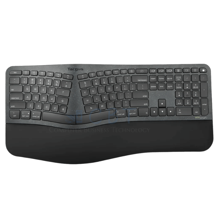 El teclado inalámbrico ergonómico sostenible EcoSmart® de Targus® es un teclado de tamaño completo que ofrece una experiencia de escritura fácil y cómoda, a la vez que utiliza materiales reciclados para proteger nuestro planeta. Diseñado para promover la sostenibilidad en el entorno laboral y más allá, los materiales principales del teclado se fabrican con hasta un 85 % de plástico reciclado posconsumo certificado por el Estándar Global de Reciclaje (GRS), que de otro modo habría acabado en nuestros cursos de agua o vertederos. ¡Incluso su embalaje es reciclado!